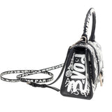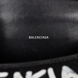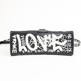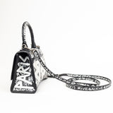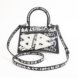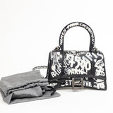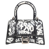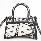 The Balenciaga Black and White Hourglass Graffiti Leather Top Handle Bag showcases the brand’s bold Parisian edge with a street-art twist. Crafted from premium black calfskin leather, this piece features striking white graffiti lettering and illustrations inspired by the city of Paris. The iconic sculptural “Hourglass” silhouette, curved base, and structured flap front give this bag a statement-making shape balanced by refined detailing.