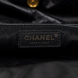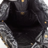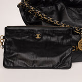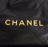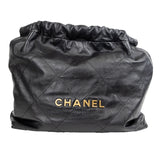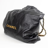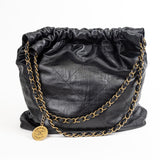 The Chanel 22 Bag embodies effortless modern luxury with its supple diamond-quilted lambskin leather and soft, slouchy silhouette. This black edition features gleaming gold-tone hardware and includes a matching removable pochette for added versatility. The top of the bag cinches with a leather drawstring, while the signature “CHANEL” logo across the front adds an iconic statement touch.