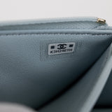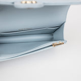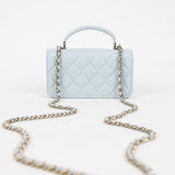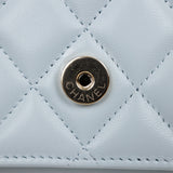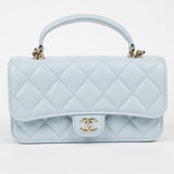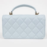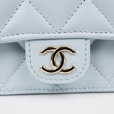 The Chanel Top Handle Rectangular Flap Bag in baby blue lambskin embodies classic elegance with a modern, structured silhouette. Crafted from soft quilted lambskin leather, it features the signature diamond stitching, gold-tone hardware, and a convenient top handle for versatile wear. The compact rectangular design makes it perfect for day-to-night sophistication while maintaining Chanel’s timeless charm.
