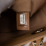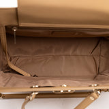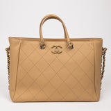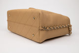 This Chanel Quilted Satchel is an exquisite piece crafted from soft beige calfskin leather with the brand’s signature diamond quilting and the iconic CC logo on the front. It features dual rolled leather handles and a leather-threaded chain shoulder strap, offering versatile carry options. The spacious interior includes multiple compartments lined in fabric, making it both elegant and functional for everyday luxury. Gold-tone hardware complements the beige tone perfectly, adding a refined finish.
