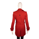 This Burberry Brit coat is crafted from a rich red wool blend with a classic double-breasted front and matching waist belt for a tailored, hourglass silhouette. It features epaulettes at the shoulders, belted cuffs, side pockets, and the signature Burberry check lining for a polished finish. Warm, structured, and timeless, it’s a standout piece of outerwear that elevates both everyday and dressy looks.