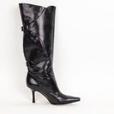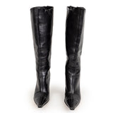 The Jimmy Choo Black Back Gathered Heeled Boots showcase a sophisticated silhouette crafted from smooth black leather. Featuring a unique gathered back detail and sleek pointed toe, these boots exude refined elegance with a touch of modern edge. The slim stiletto heel enhances the feminine profile, while the supple Italian leather construction ensures both comfort and luxury.