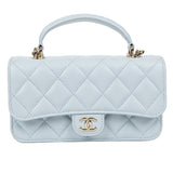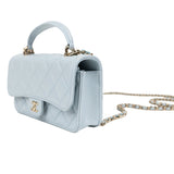 The Chanel Top Handle Rectangular Flap Bag in baby blue lambskin embodies classic elegance with a modern, structured silhouette. Crafted from soft quilted lambskin leather, it features the signature diamond stitching, gold-tone hardware, and a convenient top handle for versatile wear. The compact rectangular design makes it perfect for day-to-night sophistication while maintaining Chanel’s timeless charm.