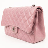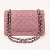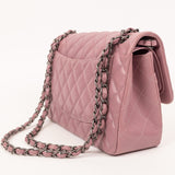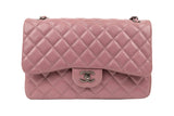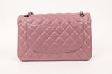 Chanel’s Jumbo Caviar Double Flap in luminous purple grained leather features silver-tone/black hardware (as shown) and classic quilted design, threaded leather-chain strap, and dual compartment flap structure for timeless elegance.