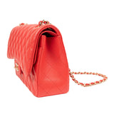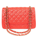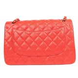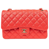 Chanel’s Classic Double Flap Jumbo in bold red caviar leather features gold-tone hardware, classic diamond quilting, and a leather-woven chain strap for versatile wear from shoulder to crossbody and one exterior rear pocket. The silvertone turnlock CC closure opens to a double flap to with one zip pocket, two flat pockets and two compartment pockets. This is an elegant and timeless piece to add to any Chanel