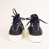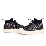 These Christian Dior high-top Walk sneakers combine luxury craftsmanship with a sporty streetwear silhouette. The navy and cream Dior Oblique canvas contrasts with smooth leather panels and a ribbed knit ankle collar for a snug, comfortable fit. The lace-up front, reinforced heel, and textured rubber sole offer durability and elevated casual style. A modern, versatile pair perfect for everyday wear or upscale athleisure looks.
