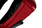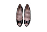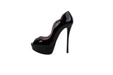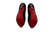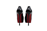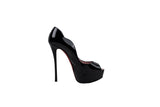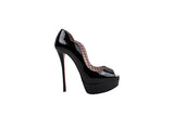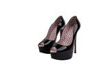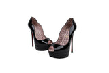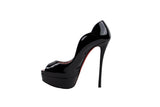 These Christian Louboutin platform peep-toe pumps are crafted from glossy black patent leather and feature the brand’s signature dramatic silhouette. Designed with a bold platform and elevated heel, this striking style delivers statement-making elegance for evening and formal wear.