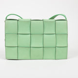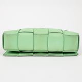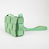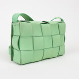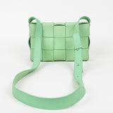 The Bottega Veneta Cassette Crossbody Bag in Green Celadon features the brand’s signature Intrecciato woven leather construction, crafted from luxurious lambskin with a structured silhouette. Designed in Italy, this modern icon offers a magnetic flap closure and an adjustable shoulder strap for a versatile hands-free carry. Its vibrant celadon hue brings a fresh, contemporary edge to any look.