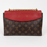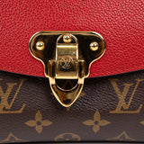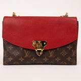 The Louis Vuitton Saint Placide Shoulder Bag blends timeless Monogram canvas with luxurious red leather for a sophisticated contrast. Crafted with gold-tone hardware, it features a sliding chain strap that allows both shoulder and crossbody wear. The flap closure opens to a spacious interior lined with microfiber and includes an interior pocket for essentials.