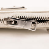 Hit the town with this Prada White Triangle Micro Crossbody Bag. This stylish crossbody is crafted from leather with a silver chainlink strap. It features zipper closure that opens to a leather interior perfect for small items like coins or lipstick. Sturdy, yet stylish, this crossbody is ready for whatever the night throws your way.