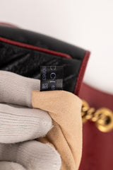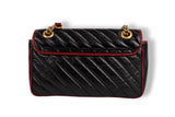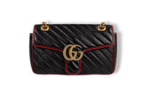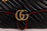 This Gucci Marmont Diagonal Flap Bag is crafted from supple black leather with a striking diagonal quilted design, enriched by bold red leather trim that adds dimension and contrast. The signature GG twist-lock closure features a sculptural, textured gold-tone finish, making it the standout detail of the piece. The interior is thoughtfully designed for daily essentials, while the chain-and-leather strap offers versatile shoulder or crossbody wear. A luxurious, fashion-forward take on the classic Marmont silhouette.