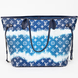 The Louis Vuitton Escale MM Tote is a statement piece that captures the spirit of summer with its gradient shades of blue, white, and navy blue. Crafted from Monogram Giant in coated canvas, the tote bag features navy blue cowhide-leather trim, silver-tone hardware, and spacious open-top construction with side laces that adjust the shape.