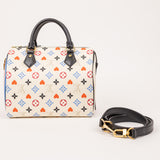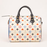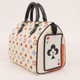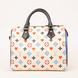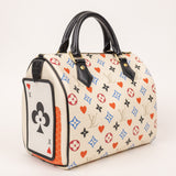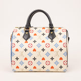 The Louis Vuitton Game On Speedy 25 from the limited-edition capsule collection features playful reinterpretations of the iconic Monogram pattern, inspired by card suits in bold red, blue, and black tones. Crafted in coated canvas with smooth leather trim, this collectible piece offers the perfect balance of fashion and function.