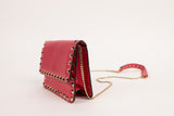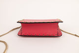 This Valentino Rockstud Flap Crossbody is crafted from vibrant pink leather and framed with the brand’s iconic gold pyramid studs, delivering a bold, modern edge. The structured silhouette pairs with a lightweight chain strap for elevated day-to-night versatility. Compact, stylish, and unmistakably Valentino, this piece brings statement glamour in a refined, wearable form.