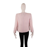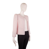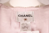 This Chanel tweed jacket is crafted in a soft pastel pink and finished in a classic collarless silhouette for an elegant, feminine look. The open front features a single CC button at the neckline, subtle sequin-trim detail along the edges, and lightly padded shoulders that give it a refined structure. Front slit pockets and a cropped length make it perfect for pairing with tailored trousers, denim, or a matching skirt for a polished day-to-night outfit.