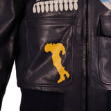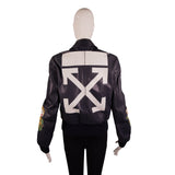 This Off-White leather aviator jacket features a rich navy blue exterior with bold printed graphics and patch-style artwork across the front and sleeves. Designed with a classic zip-front silhouette, it includes flap front pockets, a pointed collar, and ribbed knit cuffs and hem that give it a structured, bomber-inspired fit. The quilted interior lining adds warmth and comfort, making it a standout statement piece for cooler days. Iconic Off-White “MAIN LABEL” branding at the interior completes the collectible Virgil Abloh design.