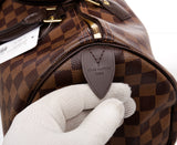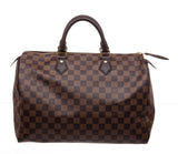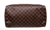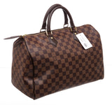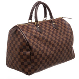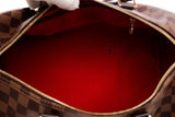 This handbag is crafted of Louis Vuitton's signature Damier checkered canvas in brown. The shoulder bag features dark brown leather trim, rolled top handles, and an optional adjustable shoulder strap with polished brass hardware. The top zippers open to a bright red fabric interior with a hanging zipper pocket.