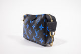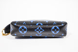 This is an authentic Louis Vuitton Digital Blue Mini Pochette Handbag. This chic mini bag is crafted of Louis Vuitton coated canvas with a monogram pattern underlay in digital blue. The top zipper opens to a black fabric interior with a leather zipper closure and gold-tone chainlini strap which can be worn as a wristlet or attached to a bag.
