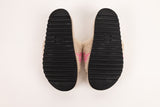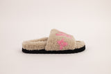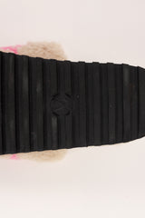 These Louis Vuitton Paseo Slides blend ultra-soft comfort with playful luxury. Crafted from plush tan shearling, they feature bright pink LV motifs across the strap for a fun, statement look. The cushioned footbed and durable black tread sole make them perfect for indoor lounging or elevated casual wear. Cozy, eye-catching, and unmistakably LV.