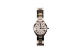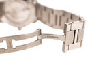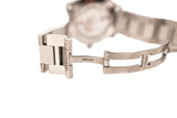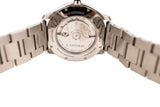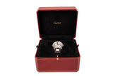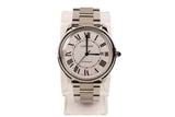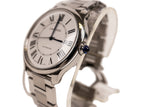 This Cartier Ronde stainless steel watch features a clean silver dial with bold black Roman numeral hour markers, blued-steel hands, and a date window positioned at 3 o’clock. The polished stainless steel case and bracelet offer a sleek, modern finish, while the automatic movement provides reliable performance. Iconic Cartier styling blended with everyday wearability.
