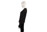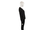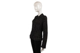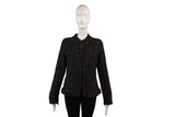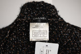 This Chanel collarless jacket showcases a sophisticated blend of brown and black tweed fibers for a richly textured finish. The sleek, button-front design and impeccable tailoring reflect the brand's mastery of luxury outerwear, making it a versatile staple for a polished professional or evening wardrobe.