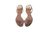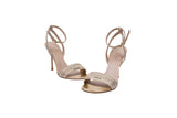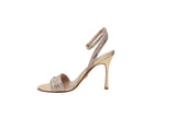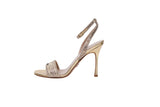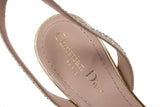 These Christian Dior Dway heeled sandals are part of the elegant Dior Or capsule, featuring gold-tone cotton embroidered with metallic thread and dazzling strass. The iconic Christian Dior Paris signature adorns the upper, making these sandals a sophisticated statement piece for formal occasions.