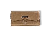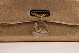 This Christian Louboutin Riviera Clutch is a glamorous evening statement crafted in shimmering gold metallic glitter with polished gold-tone hardware. The structured silhouette features the iconic Louboutin circular charm suspended from a delicate chain detail at the front slit handle. Its sleek envelope flap opens to a refined interior designed to hold your essentials with effortless elegance. Perfect for formal events, nights out, and adding a radiant touch to any look.