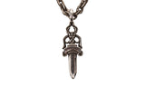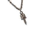 This Chrome Hearts necklace features a sterling silver dagger pendant suspended from a heavy paper chain. A bold statement piece with signature gothic detailing.