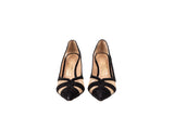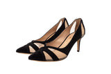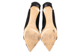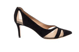 These Ferragamo heels feature black mesh panels paired with soft nude velvet for a modern, elevated look. The pointed-toe silhouette and mid stiletto heel create a sleek, elongating shape while the mesh cutouts add texture and dimension. Lightweight, stylish, and comfortable enough for extended wear, these are a polished option for evenings, events, or elevated everyday styling.