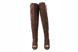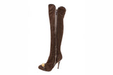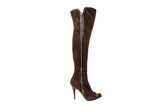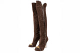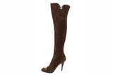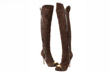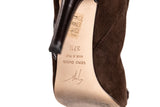 These Giuseppe Zanotti stiletto boots deliver a bold, sculptural silhouette in rich brown suede. Featuring full-length exterior zippers, gold buckle hardware, a sleek pointed toe, and a high stiletto heel, they create a striking, elongated shape. A luxury, statement boot with signature design edge and elevated craftsmanship throughout.
