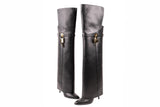 These Givenchy Lock Tall Boots feature a dramatic over-the-knee silhouette with sleek black leather construction and signature padlock hardware at the top of each boot. The pointed toe and slim heel add height and elegance, creating a sculpted high fashion look. A standout statement boot that elevates denim, dresses, and structured outerwear while embodying Givenchy’s signature bold luxury aesthetic.