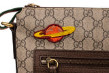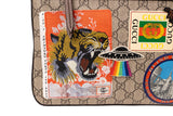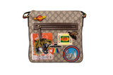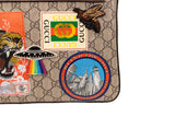 This Gucci Courier messenger bag is crafted from beige GG Supreme coated canvas and finished with multicolor appliqué patches, embroidery, and printed motifs. Designed with an adjustable web shoulder strap, exterior zip pocket, and slim profile, this piece merges collectible artistry with everyday function. A standout crossbody that embodies Gucci’s bold, eclectic styling.
