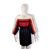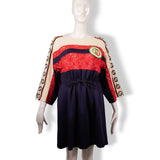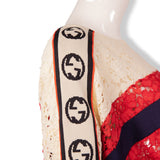 This Gucci lace-panel dress blends bold color blocking with intricate texture. The top features ivory floral lace layered over vivid red lace, contrasted by navy knit panels and finished with Gucci’s signature web striping across the chest. A drawstring waist creates shape, while wide 3/4 sleeves with embroidered GG trim add a standout vintage-inspired touch. Playful, artistic, and unmistakably Gucci — this piece is perfect for collectors and statement-dress lovers.