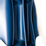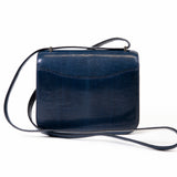 The bag features a long shoulder strap with palladium silver hardware, including an H buckle at the flap. This opens to a partitioned smooth leather interior with a flat pocket.