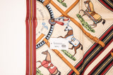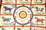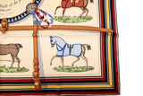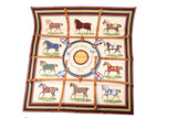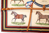 This Hermès Tenues de Jour scarf is crafted in luxurious silk and features a classic equestrian motif showcasing finely illustrated horses dressed in ceremonial riding attire. Rendered in cream with brown, red, blue, and gold accents, the design is framed by striped borders and leather strap details, reflecting Hermès’ deep heritage in horse culture and craftsmanship. A timeless collectible piece that can be styled around the neck, hair, handbag, or framed as art.