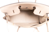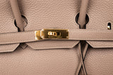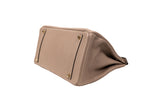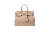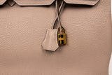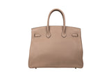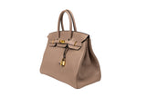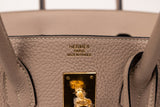 This Hermès Birkin 35 is crafted in the coveted Gris Tourterelle Togo leather and finished with polished gold hardware. The neutral dove-gray tone paired with the structured silhouette creates a timeless, understated luxury aesthetic. Designed with rolled handles, a signature turn-lock closure, clochette, keys, and lock, this Birkin is an exceptional investment piece and a refined everyday carry.