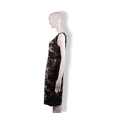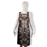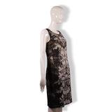 This Hugo Boss sleeveless dress features a mirrored abstract print in tones of gray, green, tan, and black, creating a sculptural, artistic visual effect. Designed with a straight silhouette and lightweight draped construction, it offers a sleek, modern look while maintaining effortless wearability. Fully lined for comfort and structure, this piece is ideal for work, events, or elevated everyday styling.