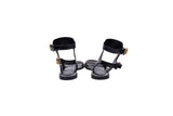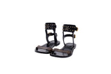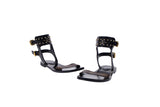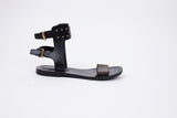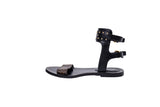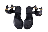 These Louis Vuitton sandals feature a striking combination of black leather and signature brown monogram canvas. Detailed with gold-tone hardware and an adjustable ankle buckle, these sandals offer a refined and versatile option for warm-weather styling.