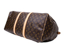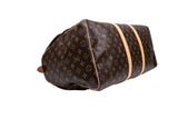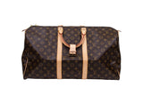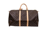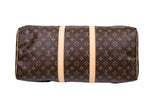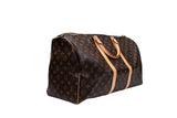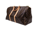 The Louis Vuitton Keepall 50 is a quintessential travel icon crafted from classic monogram coated canvas with natural cowhide leather trimmings. Designed as a cabin-friendly duffel, it features generous interior space, comfortable rolled leather handles, and gold-tone hardware for the ultimate blend of style and utility.