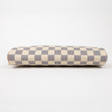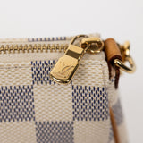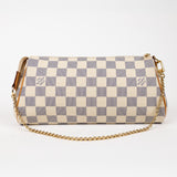 The Louis Vuitton Eva Clutch in Damier Azur canvas is an effortlessly chic accessory that transitions seamlessly from day to night. Crafted from the house’s iconic cream-and-blue checkered coated canvas and accented with natural cowhide leather trim and gleaming gold-tone hardware, this piece embodies timeless elegance. The signature Louis Vuitton nameplate on the front adds a touch of refined luxury. This versatile clutch includes a detachable strap, allowing it to be worn crossbody, on the shoulder, or as a handheld evening bag.