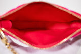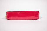 This is an authentic Louis Vuitton Vernis Valentine Key Pouch in Fuscha. This chic accessory is crafted of Louis Vuitton monogram embossed patent leather with a monogram pattern underlay in different shades of fuscha. The top zipper opens to a red leather interior with a gold-toned zipper closure and chain strap.
