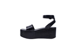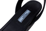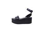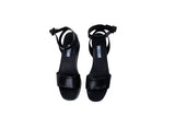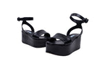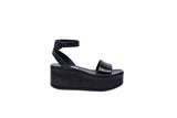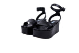 These Prada platform wedge sandals offer a sophisticated blend of height and comfort, crafted from high-quality black leather. Featuring a stable wedge heel and a sleek ankle strap with an engraved buckle, these sandals provide a contemporary silhouette that transitions effortlessly from summer daywear to evening events.