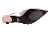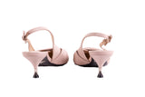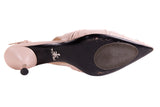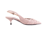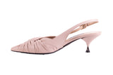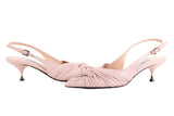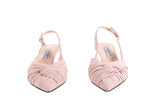 These Prada knot-detail kitten heels are crafted from smooth nude leather and feature an elegant twisted knot design across the vamp. Designed with a pointed toe and a delicate slingback strap, they offer a refined silhouette with a comfortable low kitten heel. A timeless Prada style that balances sophistication and wearability, ideal for both day and evening looks.