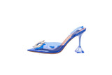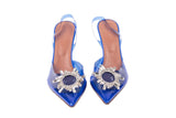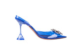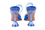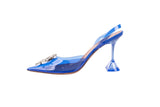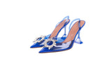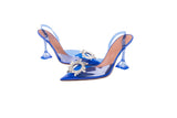 These Amina Muaddi Begum slingback heels are crafted in clear blue plexi vinyl with sculpted geometric heels and signature crystal buckle embellishments. Modern and architectural in design, they blend transparency, bold color, and standout sparkle for an elevated, fashion-forward finish. A striking statement heel perfect for evening looks, events, or editorial styling.
