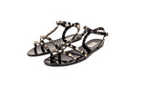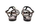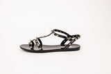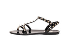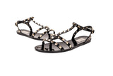 These Valentino flat sandals feature a sleek black jelly construction accented with iconic Rockstud hardware for a bold yet refined look. Lightweight and flexible, they offer comfortable everyday wear while maintaining the unmistakable Valentino edge. A modern, effortless sandal that pairs luxury design with casual versatility.