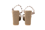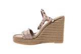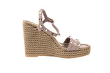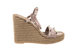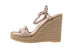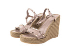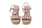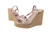 These Valentino Rockstud wedge sandals are crafted in smooth taupe leather and set on a braided rope espadrille wedge. Designed with signature pyramid stud detailing, adjustable ankle straps, and an open-toe silhouette, they balance elevated craftsmanship with relaxed summer styling. A versatile luxury staple ideal for warm-weather outfits and resort looks.