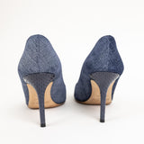 These Jimmy Choo pumps combine refined style and texture with their deep blue chambray leather upper and elegant pointed toe. The sleek silhouette is complemented by a sculpted 85 mm stiletto heel and smooth leather lining, making these pumps a polished choice for both professional occasions and elevated evenings.