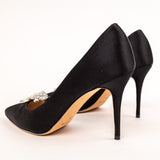 Head out with these Manolo Blahnik Black Satin Nadira Pumps. These pumps are made from satin and have a crystal design along the outer edge of the toe. They come with a 3 in heel. Perfect for any night out. Size 38.5.