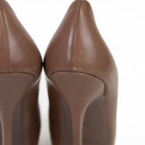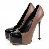 These chic heels have a 1 1/2 inch platform and a 5 inch stiletto with a blunt toe and are crafted of nude leather shoe and black patent leather toe.