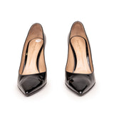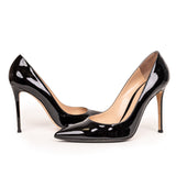 These Gianvito Rossi Patent Leather Heels are a sleek, elegant staple crafted in glossy black patent leather. Designed with a classic pointed toe and a refined stiletto heel, they offer a timeless silhouette perfect for formal events, business attire, or evening wear. The smooth leather interior provides comfort, while the high-shine exterior adds a polished, luxurious finish.